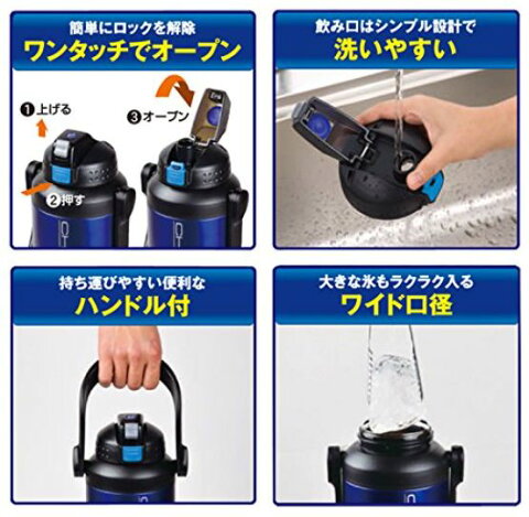 ●化粧箱入り ●本体サイズ(約):幅150×奥行125×高さ350mm、 取っ手を立てた高さ430mm ●製品重量:1.16kg ●保冷効力:10度以下(6時間) ●実容量:2.2L ■素材・成分:内びん:ステンレス鋼、 胴部:ステンレス鋼(アクリル樹脂塗装)、 ふた栓本体・ハンドル:ポリプロピレン(耐熱温度100度)、 キャップ:ABS樹脂(耐熱温度80度)、 開閉ボタン・ロックレバー:ポリアセタール(耐熱温度80度)、 パッキン・飲み口パッキン・底キャップ:シリコーンゴム(耐熱温度180度) ※保冷専用です。