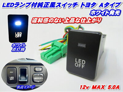 純正風スイッチ トヨタAタイプ LEDイルミ付き ホワイト発光 適合車種:タイトル表示車種用違和感のない上品な仕上がり純正で使われていないスイッチホールにデイライトや後付けフォグ等のLED関連部品のON/OFFスイッチとしてジャストフィットする純正風スイッチです。