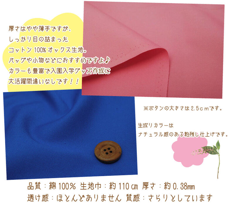 とっても使いやすいシンプルな無地のオックス生地 安心の国産品質と丈夫な綿素材、豊富なカラーで男の子にも女の子にもおすすめ 入園入学用のバッグや小物など幅広く使えるファブリックです 《50cm単位での販売でございます》 表示価格は50cmの価格です。